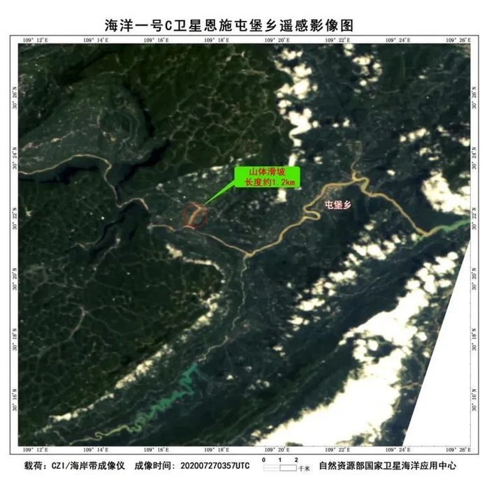 2020年7月21日,湖北恩施土家族苗族自治州屯堡乡马者村沙子坝滑坡体前缘滑入清江,一度堵塞河道形成堰塞湖。当晚,应湖北省卫星技术应用中心请求,查看了HY一1C/1D卫星轨道以及最近数据。在7月19日HY一1C卫星遥感图像中,马者村被云覆盖,位于屯堡乡的河道水体呈现土黄色浑浊状态。7月27日,HY一1C卫星轨道经过屯堡乡时正好无云,从获取的图像中可看到发生滑坡处明显不同,经量算滑坡长度约1200米、宽度约280米,滑坡处的上下游河道还是土黄色状态,与现场调查结果基本一致。