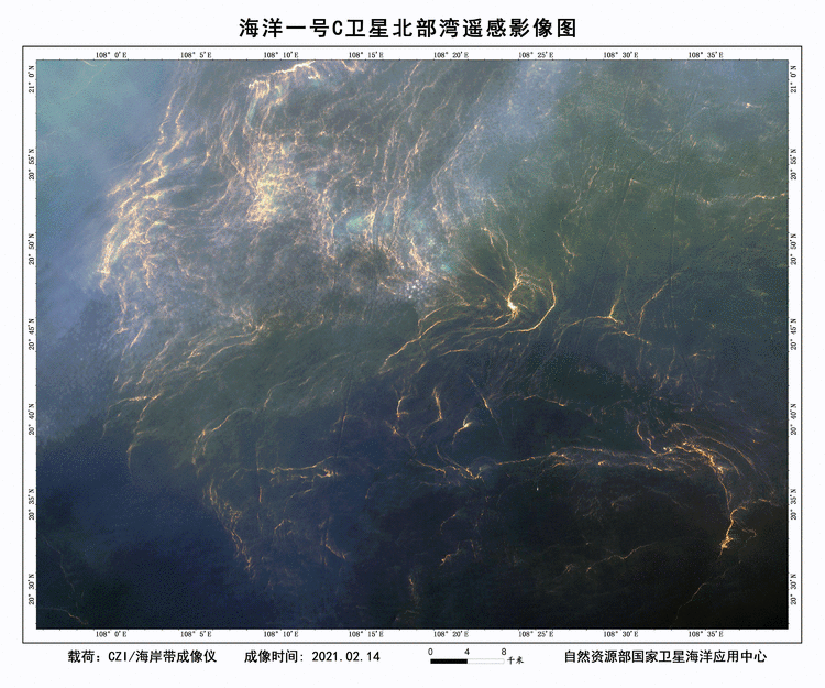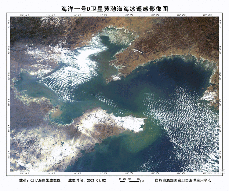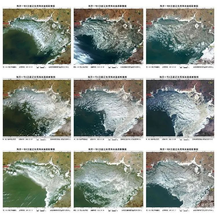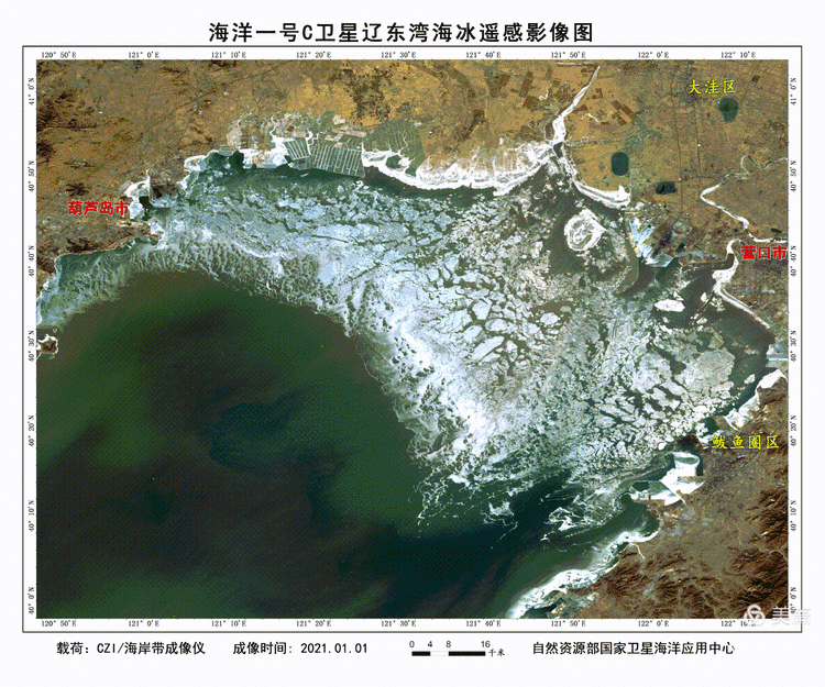 每年11月下旬到第二年3月底,渤海、黄海北部有不同程度的结冰,严重的海冰可影响海上交通运输和海上工程作业,危及海上石油平台安全。利用HY一1C/1D卫星海岸带成像仪、地球观测系统EOS/MODIS可见光数据、GF一3卫星及国外卫星SAR数据,制作专题产品开展业务化海冰监测,多颗卫星在空间、时间以及探测手段方面优势互补,HY一1C/1D卫星组网后,50米空间分辨率的海岸带成像仪对渤海实现3天至少两次覆盖,获取数据时效快,加上高分三号卫星SAR载荷补充,实现可见光与SAR协同,得到的信息更丰富,为海洋工程以及海冰预报提供了有力支撑。