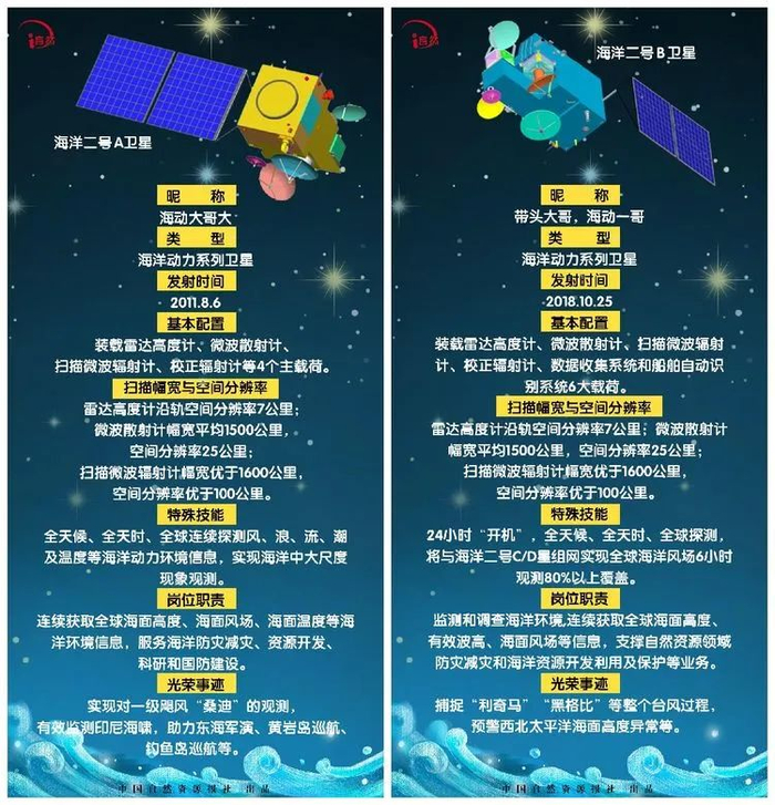 HY一2A、HY一2B卫星用于全球海面风场、有效波高、海面高度、海表温度等多种海洋动力环境参数监测,配置雷达高度计、微波散射计、扫描微波辐射计、校正辐射计、DCS、AIS等载荷,HY一2C、HY一2D卫星配置雷达高度计、微波散射计、校正辐射计、AIS载荷,HY一2B、HY一2C、HY一2D三星组网每天可多次提供全球海面风场、有效波高、海面温度,直接为灾害性海况预警预报提供近实时遥感观测数据,可全天候监测台风、海冰、巨浪等海洋灾害。