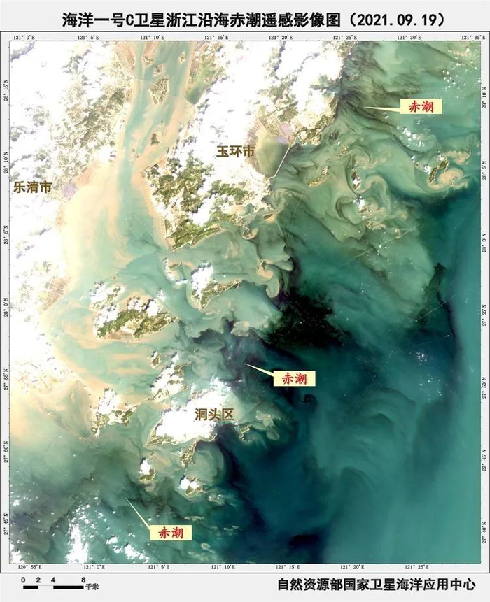 赤潮频发是近岸海域环境污染的主要因素之一,既严重破坏了海域生态环境,又影响海洋渔业和滨海旅游业发展,甚至危害到人类健康。海洋中的浮游生物爆发性急剧繁殖造成海水呈现黄色、绿色、褐色、红色等不同颜色。海洋一号C/D卫星海岸带成像仪能很好识别,自发射以来曾多次监测到渤海、黄海、东海、南海发生的赤潮,已成为海洋生态环境监测的有力工具。利用HY一1C/1D卫星,监测到了金州湾、渤海湾、天津海岸、莱州湾、威海海域、浙江海岸、福建海岸、广东沿海、深圳湾、北部湾、海南沿海等海域的多次赤潮事件,获取了赤潮位置、分布范围等重要信息,及时提供给了沿海省市相关部门。