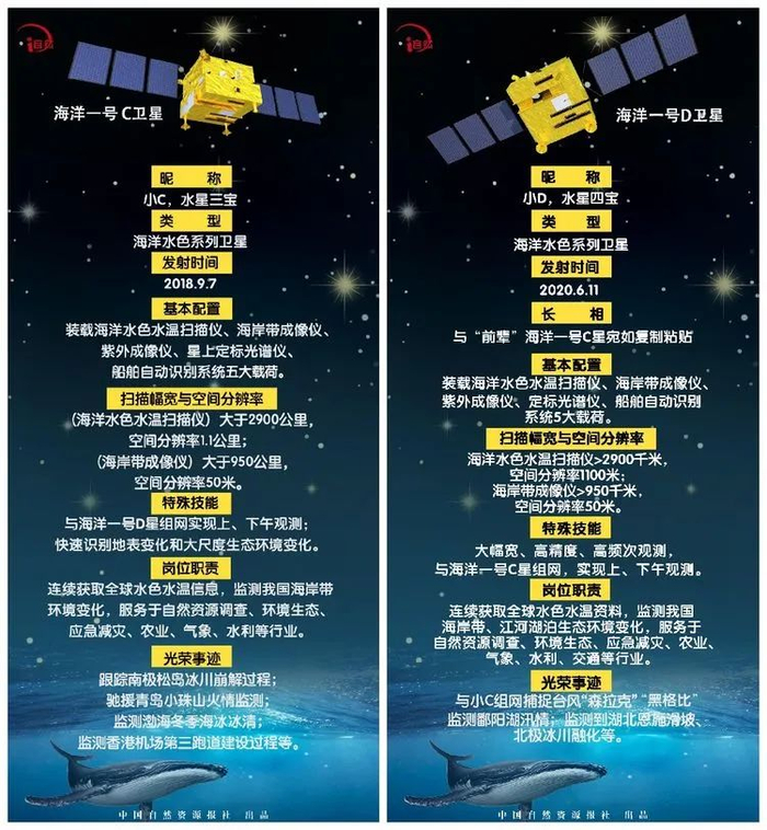 HY一1C、HY一1D卫星用于全球海洋水色要素探测、海表温度探测和海岸带动态环境监测,以海洋探测为主,陆海兼顾,配置海洋水色水温扫描仪(COCTS)、海岸带成像仪(CZI)、紫外成像仪、定标光谱仪以及船舶自动识别系统等载荷。双星上下午组网观测,海洋水色水温扫描仪全球开机,扫描幅宽3000千米,空间分辨率1千米,对全球海洋与陆地进行四次(经过赤道的地方时为10:30am、1:30pm、10:30pm、1:30am) 观测,海岸带成像仪在中国海岸带及关注区域开机工作,幅宽1000千米,空间分辨率50米, 每三天对中国海岸带及关注区域实现两次观测,由于载荷具有多种空间分辨率、高信噪比、高动态范围和宽刈幅、时效快等优点,成为自然灾害监测的有效工具,已在台风、渤海海冰与南北极海冰、绿潮、赤潮、溢油、火山与浮石、洪涝、林火、蓝藻、滑坡与堰塞湖、沙尘暴等灾害监测中发挥重要作用。