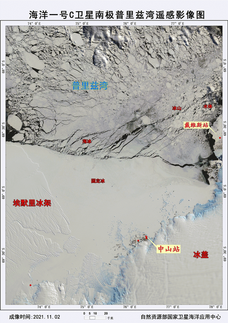 目前,我国极地科考遥感服务保障主要靠我国海洋卫星及其他国内外卫星相结合完成。HY一1C/1D 实现对极地准业务化监测,HY一1C/1D卫星海洋水色水温扫描仪每天实现对全南极、全北极全覆盖,在夏季海岸带成像仪具备1天两次以上的探测的能力,在北纬以及南纬60°~90°区域内已拍摄几万景,曾连续获得局部区域6天均为晴空数据场景,利用HY一1C/1D卫星数据开展了雪龙船航线保障服务,监测了松岛冰川崩解、埃默里冰架与布伦特冰架断裂、康格冰架消失、D28/A74/A23冰山移动、海冰变化、冰间航道、潮汐缝、雪垄、冰盖、冰帽、冰川、冰舌以及两极地貌信息变化。