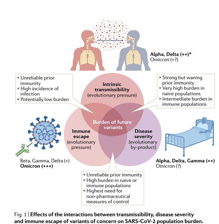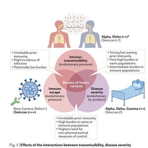 病毒的适应性程度可以通过其有效再生数 (Rt) 体现。 Rt 是感染病例在人群中产生的继发感染总数。因此,适应性最强的变异株是传播给最多宿主的变异株。在每个人都易感的人群中,病毒可以通过变得更具传染性来实现这一目标。早期的“关切变异株(VOC)”就是这样演化而来的:阿尔法和德尔塔的传染性都比前一个主导毒株高出大约50%。在大量感染人口被占据流行主导的过程中,每一个VOC都迅速取代另一个VOC。