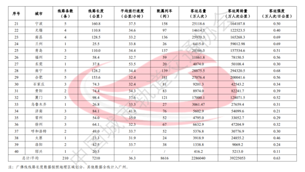 澎湃新闻发现,在纳入上述《报告》地铁运营情况统计的40城中,有22座城市2021年的GDP超过一万亿元。