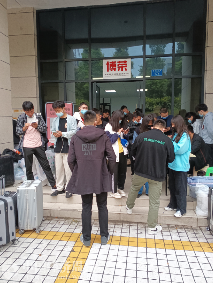3月底的重庆并不暖和,潮湿的空气中时不时夹杂着毛毛细雨。前来应聘的打工者,几乎都带着厚厚的棉被,除了身上鼓囊囊的背包,旅行箱上都挂着一些生活用品。但人群中有个女孩例外,她身穿短裙、丝袜,脚踩高跟鞋,穿着清凉,来来回回穿梭在这群打工者之间,还会热情地帮人拿行李。