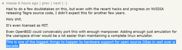 不过,这次开源确实意味着 NVidia 已经发布了一个能够使用 Linux 内核中 GPL-only API 的内核驱动程序,尽管这个初始版本不使用旧驱动程序未使用的任何 API。