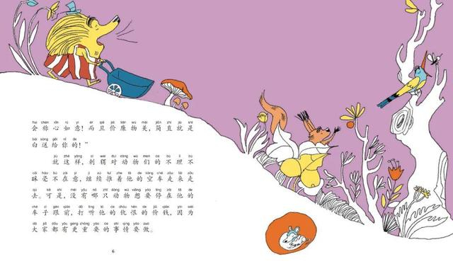 《刺猬的买卖》这本相对其他五本有些暗黑。它讲的是在安静而和谐的森林里,来了一只贩卖仇恨的刺猬,松鼠最先购买了第一份仇恨,刺猬告诉松鼠,你们辛苦收集橡果,但是掉在地上的橡果却被老鼠捡了去,他痛骂老鼠的坐享其成,并建议松鼠以不要再让老鼠捡到橡果作为对老鼠的惩罚。老鼠没有了食物,便去求助刺猬,刺猬又在老鼠面前大骂松鼠,于是卖出了第二份仇恨……渐渐地,河狸和鸟儿也卷入仇恨之中,动物们互相抱怨,森林变得死气沉沉,只有刺猬待在暖和的窝里,悠闲自在。最后动物们认识到是刺猬造成了这一切,但是在他们赶走了刺猬后,又各忙各的,很快将刺猬忘记了……