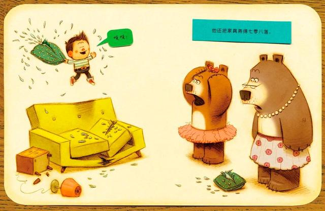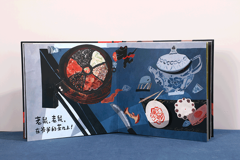 这是一本好玩的立体书,故事很简单,是一个小孩在厨房里看见了民间传说中的“老鼠嫁女”,可是小孩一来,老鼠们都跑得不见了,它们有的跑去爷爷的茶几上,有的跑去爸爸的茶缸里,有的跑去奶奶的毛线里……