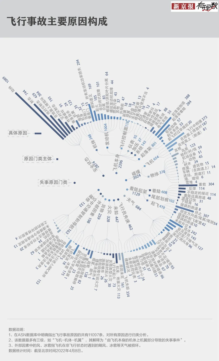 飞机失事,查找并消除引起事故的关键因素,进而防止类似的相关因素引起更大事故尤为重要。ASN数据库里明确标记飞机事故原因的有1.1万件,我们根据官方归类对其进行梳理,总结出12大类及113条具体原因。