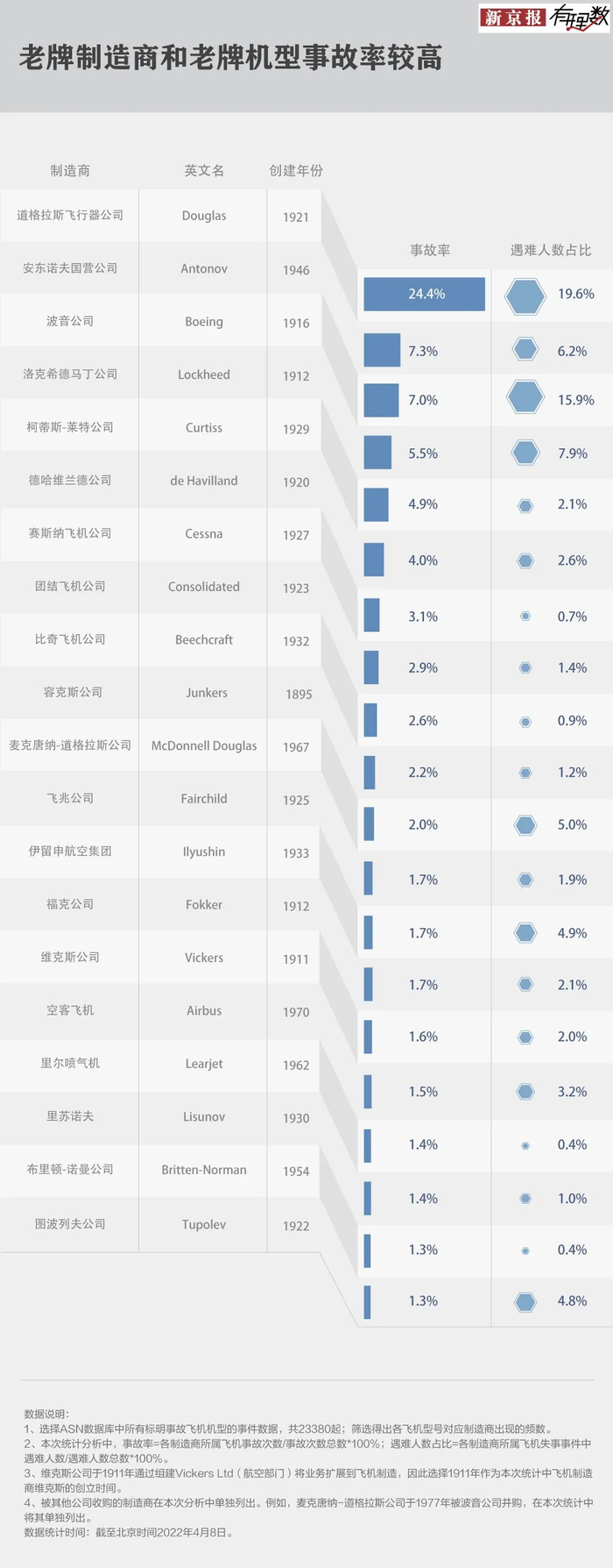 仅看事故率排名前20的飞机型号,除了已停业和被并购的公司,大部分制造商都有着接近百年的飞机制造历史,而最“年轻”的空客公司创立至今也超过50年。