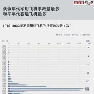 人类历史上飞机失事的第一个高峰是在二战时期,在上世纪40年代,飞机作为重要飞行工具被大量应用到二战中,1944年和1945年事故量分别达到1505起和1444起,平均每天都有4架飞机发生事故,之后随着战争结束事故量逐渐降低。