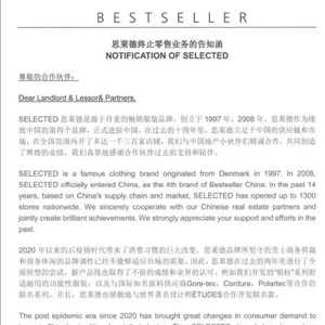 5月9日,网上流传出一份关于《绫致时装发布SELECTED终止零售业务告知函》(下文简称《告知函》),宣布将于今年7月31日前,关闭该品牌在中国线下的全部零售商铺,共计1300多家。《天下网商》致电绫致中国官方客服,得到的回复是“没有接到上级通知”,而其电商客服暂未回应。