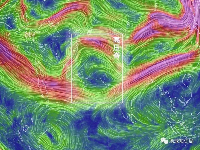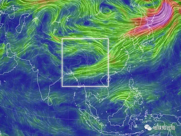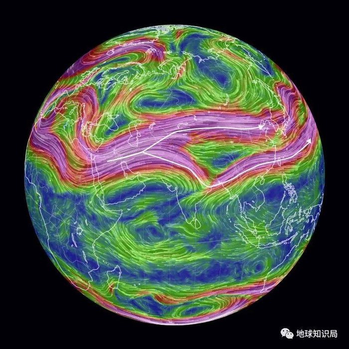 在此之上的250hPa高度场上,自西向东环绕全球、中心最大风速可达50~60m/s的副热带急流。这一急流在冬季也分为了南北两支。其中位于青藏高原南侧、对流层高层的南支副热带急流经过恒河平原,最后在中国南部到日本一带,与北支副热带急流汇合。