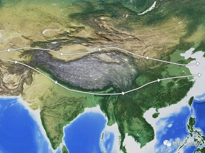 在冬春季节,由于太阳辐射位置偏南,全球行星风带也整体偏南,冬季偏南的西风带穿过了青藏高原,高大突起的高原使得500hPa以下的西风气流出现明显的分支、绕流,形成了南北两支西风气流。
