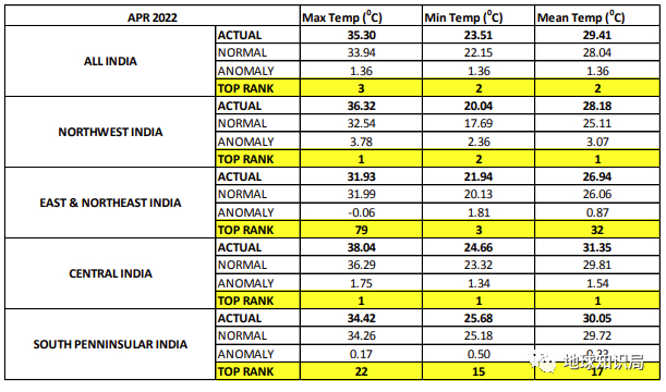 4月印度全境及各区域温度▼
