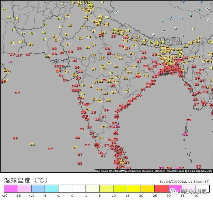 在此次热浪高峰期(4月29日至30日)一天中最热的时候,印度和巴基斯坦的许多地区的湿球温度都超过28℃,印度中部城市那格浦尔甚至记录了32.2℃的湿球温度。