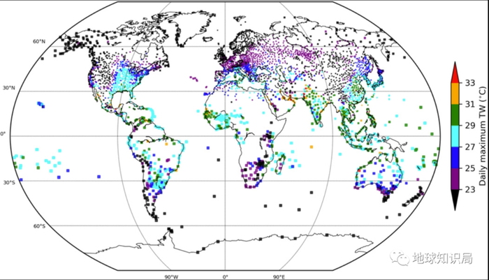 1979~2017年期间气象站的湿球温度最大值▼