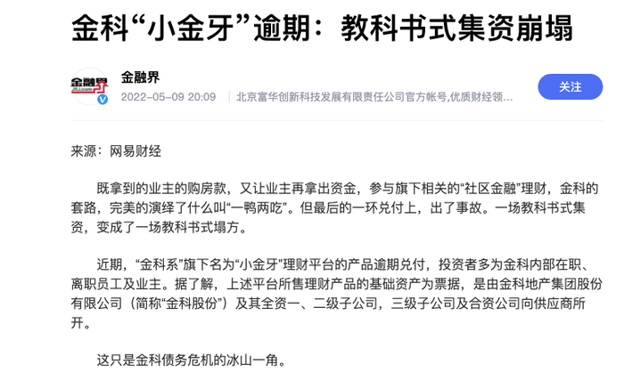 近日,据网易新闻报道,“金科系”旗下名为“小金牙”理财平台的产品逾期兑付,投资者多为金科内部在职、离职员工及业主,投资产品的底层资产是金科的相关票据。
