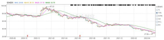 2021年1月8日,恒瑞医药的股价冲至历史最高位97.22元/股,市值超6000亿元。此后,恒瑞医药的股价便一路下行,跌至2022年4月27日的27元/股。仅用一年半,恒瑞医药的市值就蒸发逾4000亿。5月12日,恒瑞医药的收盘价为30.03元/股。