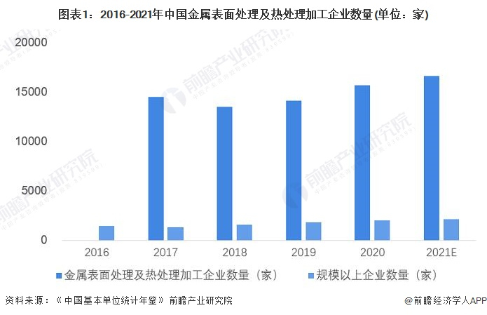 热处理加工属于金属表面处理及热处理加工的统计范畴之内。根据《中国基本单位统计年鉴2021》数据,截至2020年底,中国金属表面处理及热处理加工企业数量为15688家,其中规模以上金属表面处理及热处理加工企业数量为1989家。初步估算2021年我国金属表面处理及热处理加工企业数量约为16634家,规模以上企业超过2100家。