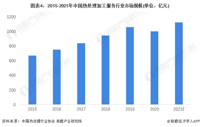 综合热处理设备制造及工艺材料行业以及热处理加工服务行业市场规模,2020年,中国热处理行业总产值约1200亿元。其中,热处理加工营业额约1000亿元,热处理设备和工艺材料销售营业额约200亿元(包括约150亿热处理装备和约50亿的工艺材料)。前瞻综合热处理行业下游市场发展情况综合测算,2021年,中国热处理行业市场规模为1345亿元,同比增长12.1%。