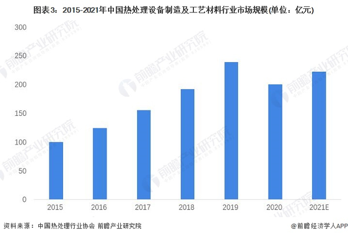 根据中国热处理行业协会数据,2020年,中国热处理设备和工艺材料销售营业额约200亿元,其中,热处理装备(含工装)约150亿元,工艺材料约50亿元,较“十二五”末增加近一倍。初步估算2021年,中国热处理设备和工艺材料销售额约达到222亿元。