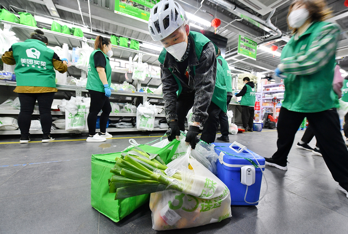 5月13日早晨7点,在叮咚买菜海淀区五路居站和美团买菜东城彭庄,所有骑手已全员上岗。为配合核酸筛查期间的保供工作,生鲜电商平台正从仓储、产能和配送等方面加大投入,确保居民能在线上买到菜。