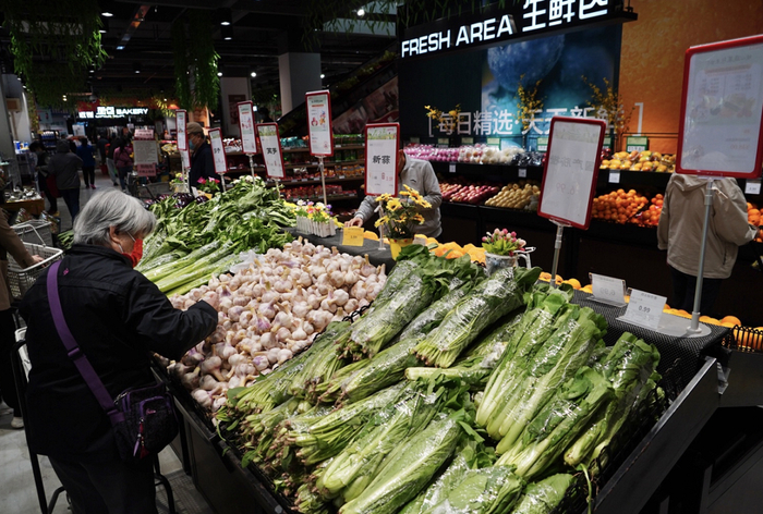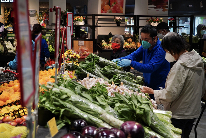5月13日,京客隆华安店新鲜的果蔬肉蛋摆满货架,顾客经过查验48小时核酸阴性证明后进店购物,秩序井然。