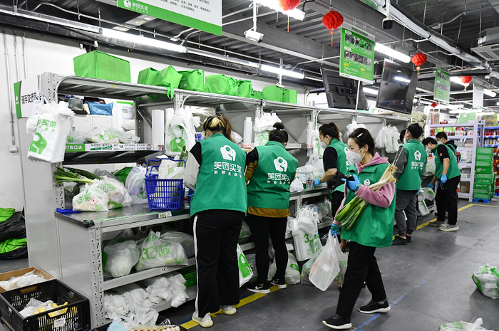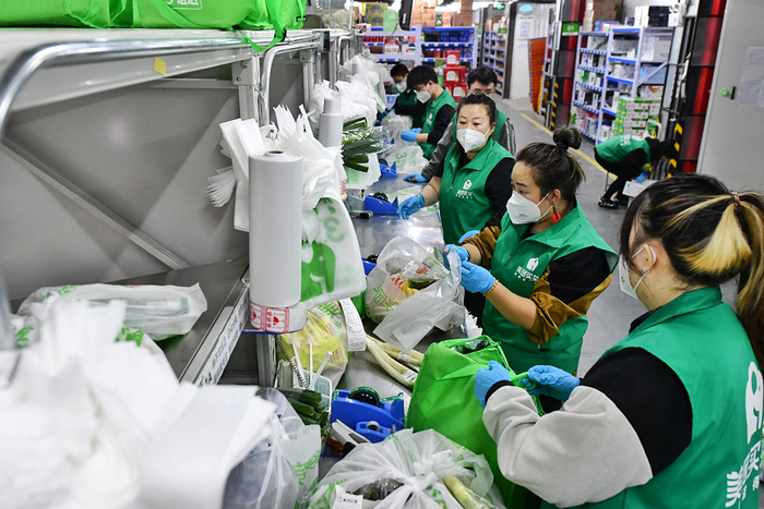 5月13日早晨,在美团买菜东城彭庄站,分拣、打包、配送工作从6点半就开始进行,保障市民全天生鲜食品供应。