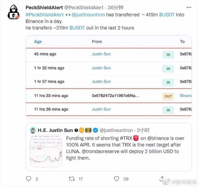 普通投资人经历暗淡时刻之际,5月11日,派盾(全球顶尖区块链安全公司)在推特上发文表示,波场TRON创始人Justin Sun(孙宇晨)单日将4.19亿枚USDT转入Binance,过去2小时内又从Binance转出3.19亿枚USDT。这意味着他一天内亏损了一亿!