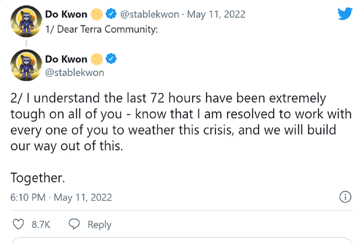 面对币值大幅缩水,Terra创始人Kwon出来喊话:“过去72小时对每个人都非常艰难,我决心与每个人一起度过这场危机,寻求自救方法。”不过币圈业内警告:UST如果没有救回来,不要轻易尝试抄底LUNA。