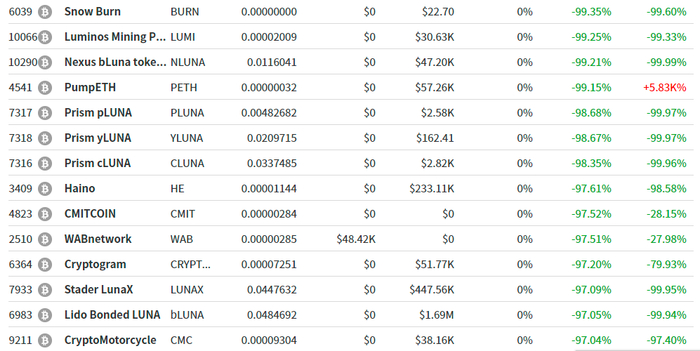 一度被币圈玩家称为“币圈茅台”的LUNA币遭到血洗,狂泻99.99%!据coingecko,LUNA币曾在4月5日达到119.5美元高点,也达到了其最高市值410亿美元(约合人民币2786亿元)。不过,近段时间LUNA币一直下跌,截至发稿其最新价已不足1美分,仅0.0001美元。