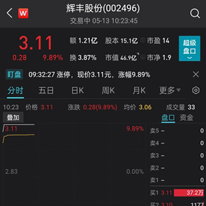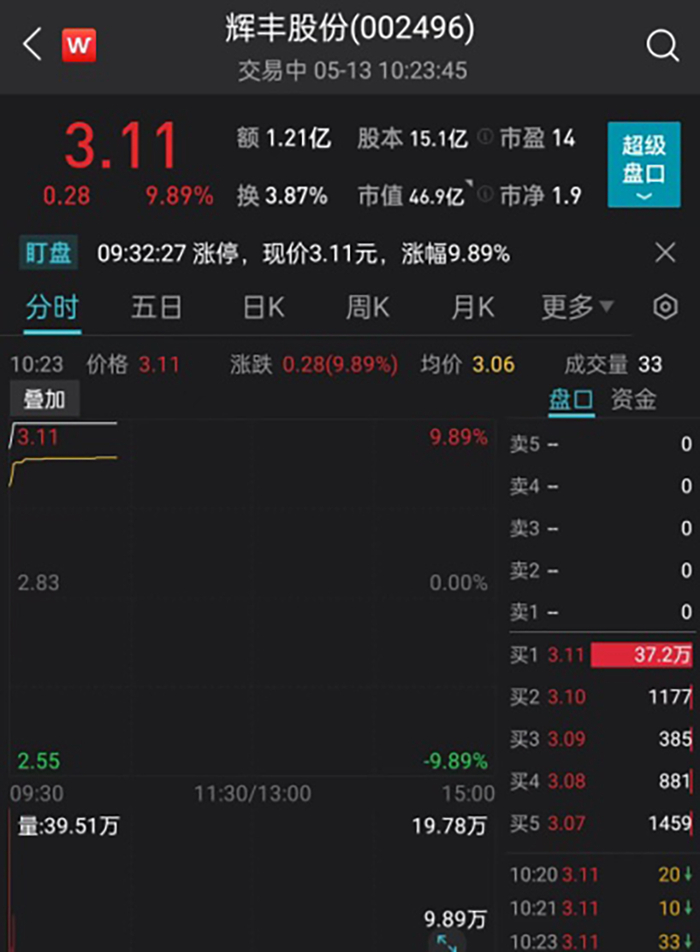 5月13日早盘,刚刚“脱帽”复牌的辉丰股份迅速涨停。