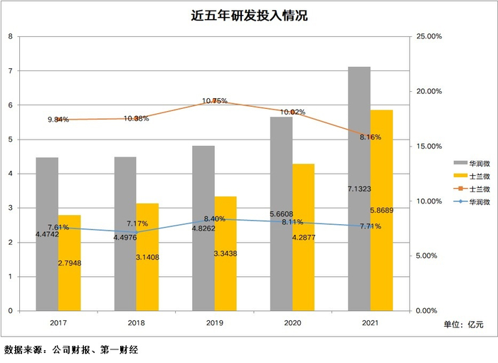 研发投入方面,近年来士兰微研发投入力度较华润微稍高,但金额仍不及华润微。