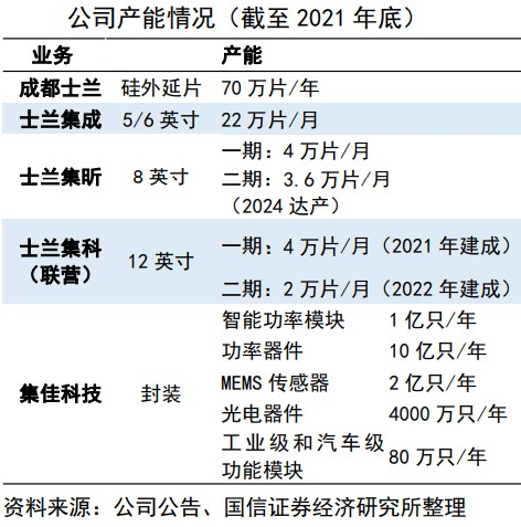 士兰微方面,其子公司士兰集成主要聚焦5、6英寸,月产能22万片;子公司士兰集昕聚焦8英寸,月产能约4万片,二期月产能3.6万片,约2024年达产;参股公司士兰集科基本完成了12英寸线一期产能建设目标,二期月产能2万片在建。