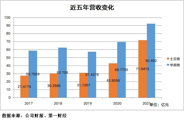 而近五年来,士兰微的营收规模一直在追赶华润微,2021年营收差距有所缩小。