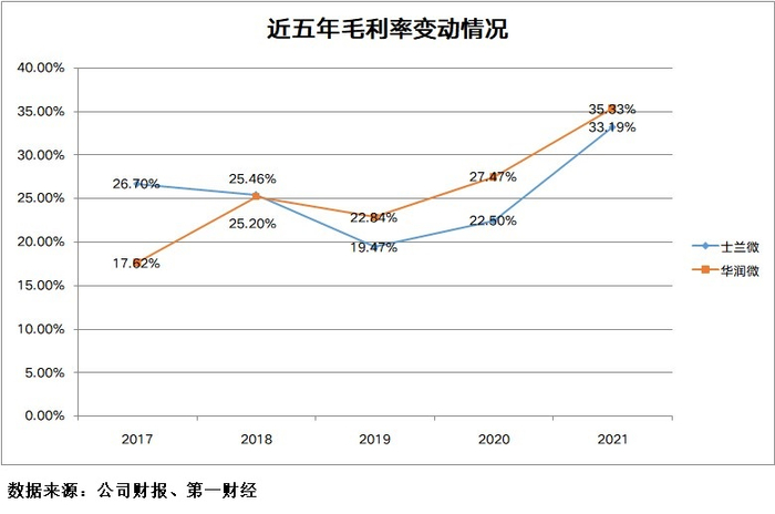 第一财经观察发现,士兰微和华润微的毛利率水平在2021年都有大幅提升。其中士兰微2021年毛利率为33.19%,同比提高10.69个百分点;华润微2021年毛利率为35.33%,同比提高7.86个百分点。