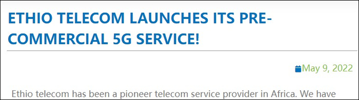 5月9日,埃塞俄比亚电信公司(Ethio Telecom)宣布,启动5G网络商用服务前测试,首先在首都亚的斯亚贝巴6个区域启动5G网络服务,未来将逐步扩大覆盖范围,而埃塞电信本次5G服务的设备供应商则正是此前被美国推上风口浪尖的华为。