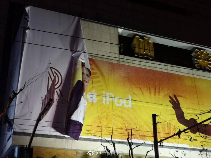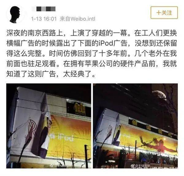 就在几年前,就有过这样一幕:一位博主在深夜经过南京西路时,恰逢工人在换横幅广告,较新的广告揭下后,底下藏着的iPod剪影广告露了出来。