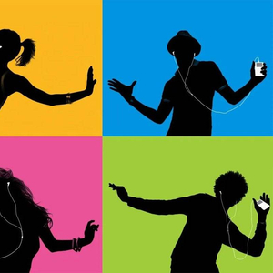 黑色的剪影,色彩强烈的背景,全都衬托着飞舞的白色耳机线,和人物们手里拿着的iPod。