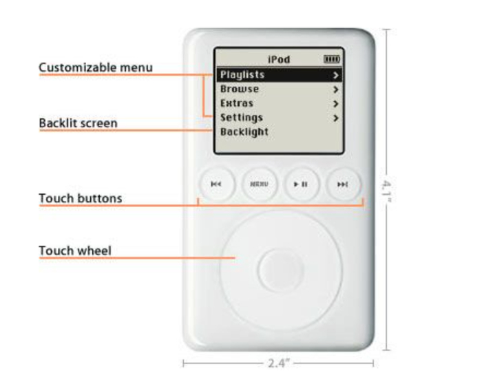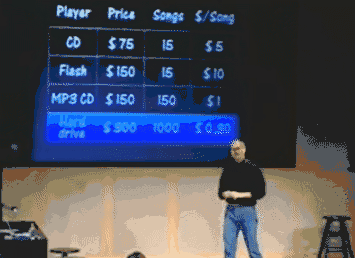 在2001 年 10 月 23 日,史蒂夫·乔布斯于苹果公司的Infinite Loop园区的一间小屋子内,用简单的PPT向台下的数十位观众展示了自家的新产品:iPod。