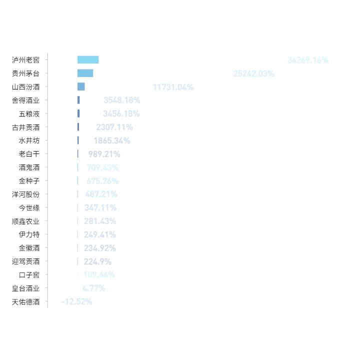 沪深两市最早上市的白酒企业——山西汾酒(1994年1月6日上市)和泸州老窖(1994年5月9日上市),总市值分别从26.16亿、8.56亿,增至3095亿、2942亿,涨幅分别为117.31倍和342.69倍。