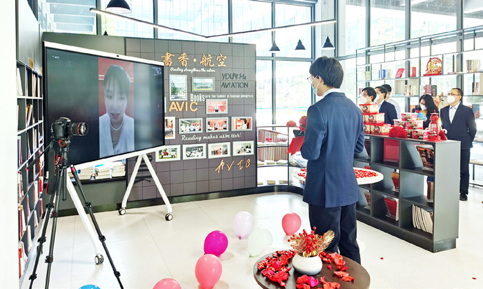 没有洁白的婚纱,没有浪漫的舞台,就连婚庆物资都是同事们“众筹”而来,5月3日,在航空工业上电的职工书屋里,举行了一场特殊的“云婚礼”。新郎、新娘与双方父母身处四个地点,隔着屏幕完成了结婚仪式。