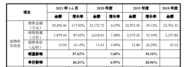 招股书显示,同期内,宠物牵引用具销售收入分别为2.37亿元、3.3亿元、3.52亿元以及2.95亿元,占主营业务收入的比例分别为54.81%、64.27%、58.01%、61.90%。报告期内,该系列产品的毛利率分别为33.15%、34.28%、34.89%、29.96%。