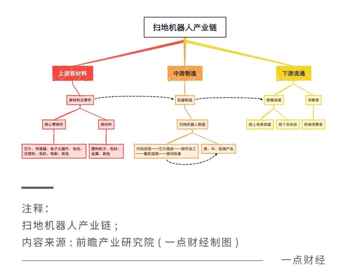 从产业链的角度看,扫地机器人分为上游部件:机电设备、电池、主板芯片等零部件制造行业;中游制造:包括自主品牌和代加工企业等;下游流通:分为线上电商和线下实体店。