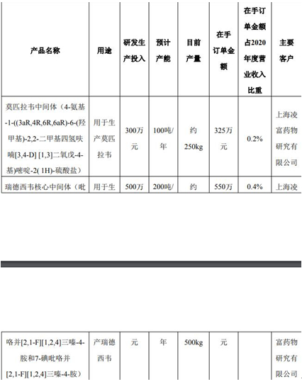根据富祥药业2022年1月29日披露的《关于对深圳证券交易所关注函的回复公告》,目前富祥药业生产供应的用于生产新冠治疗药物莫匹拉韦、瑞德西韦的中间体产品在手订单分别为325万元和550万元,占2020年收入的比例仅为0.2%和0.4%,对应的研发投入为300万元和500万元;目前富祥药业生产莫匹拉韦、瑞德西韦的核心中间体暂未形成收入;富祥药业生产前述相关产品仅能供应给上海凌富,不能供应给其他方;目前富祥药业生产莫匹拉韦、瑞德西韦的中间体均未直接或间接供应给辉瑞、吉利德、默沙东;目前富祥药业没有和辉瑞、默沙东、真实生物、吉利德签订与新冠治疗药物相关的合同。