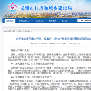4月29日,无锡住建局再发文:《关于在全市范围内开展“红五月”房地产开发项目消费促销活动的通知》,倡导各大房企加大对购房者的优惠力度。