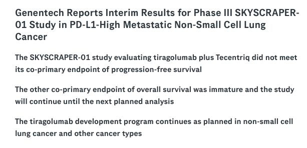 当地时间5月10日,罗氏旗下的基因泰克公布了三期临床试验“Skyscraper-01”的中期结果——评估发现Tiragolumab 加Tecentriq(阿替利珠单抗,也称“T药”),用于治疗非小细胞肺癌的试验未达到其无进展生存期(PFS)的共同主要终点。