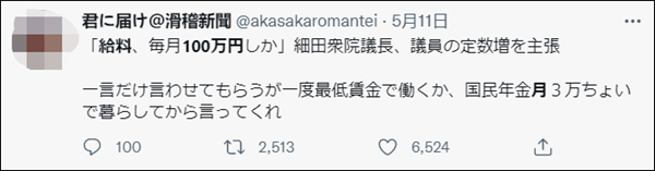 “‘只有’100万这样的话也能说出口。议员的工作,说起来就是睡睡觉、旷旷工也能拿到100万吧。这是我们的‘血税’啊。物价也在上涨,少子化越来越严重,这是因为你们把我们缴的税都贪走了吧。”