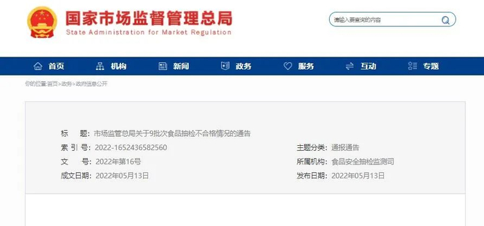 5月13日,市场监管总局网站发布关于9批次食品抽检不合格情况的通告〔2022年第16号〕。通告称,近期,市场监管总局组织食品安全监督抽检,抽取粮食加工品、食糖、茶叶及相关制品、乳制品、饮料、酒类、糕点、炒货食品及坚果制品、饼干、淀粉及淀粉制品、方便食品、薯类和膨化食品、蛋制品、豆制品、蜂产品、罐头、蔬菜制品、水果制品、肉制品、水产制品、调味品、冷冻饮品、速冻食品、糖果制品、婴幼儿配方食品、保健食品、特殊膳食食品和食用油、油脂及其制品等28大类食品450批次样品,检出其中淀粉及淀粉制品、豆制品、蜂产品、罐头、水果制品、水产制品等6大类食品9批次样品不合格。发现的主要问题是,微生物污染、食品添加剂超范围超限量使用、质量指标不达标等。产品抽检结果可查询https://spcjsac.gsxt.gov.cn/。